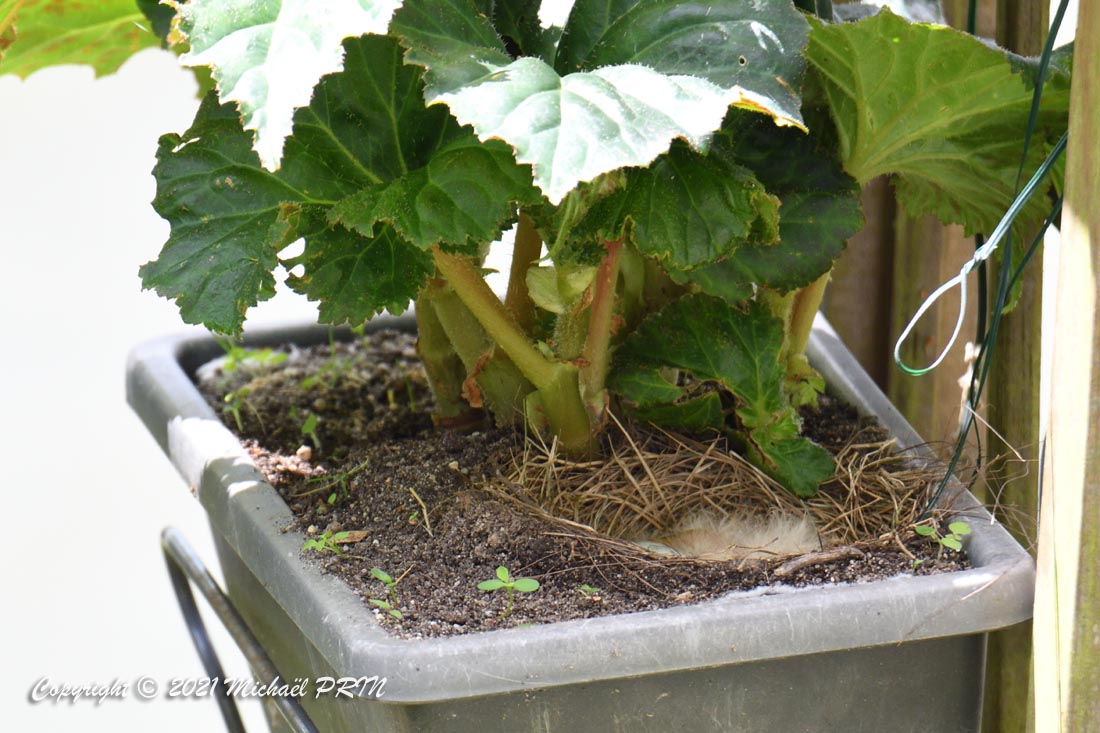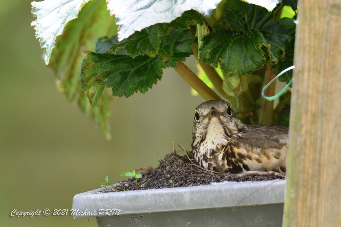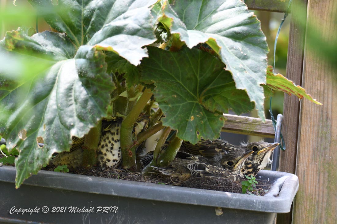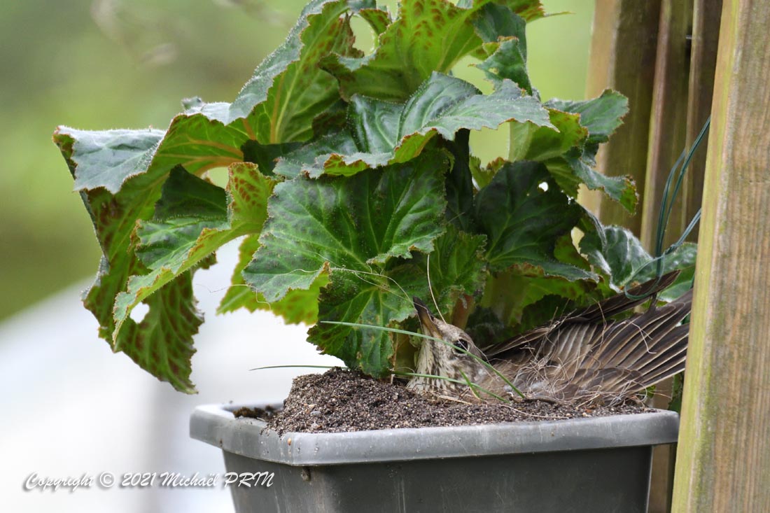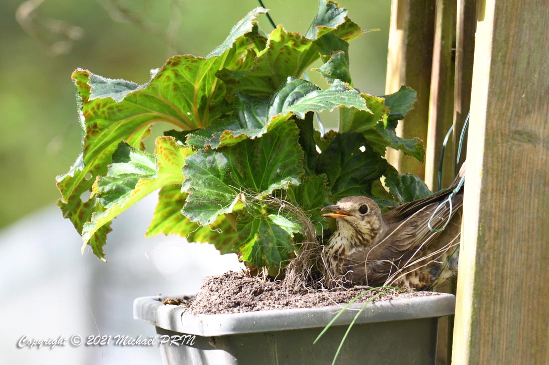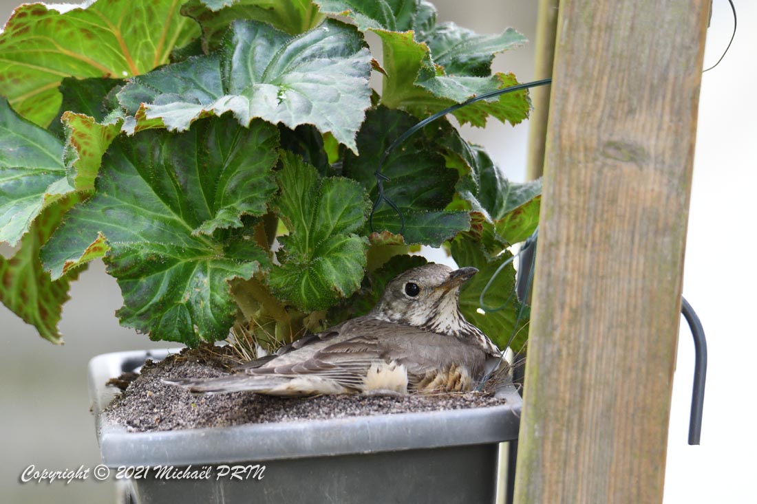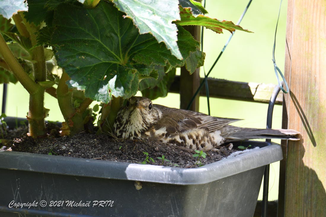 Cette femelle grive draine a choisi comme emplacement pour son nid une jardinère de bégonias située à 1,50 m du sol à côté d'un bassin. J'ai beaucoup hésité à la laisser continuer car je passe très souvent à moins de 2 mètres de l'arche où est posée la jardinière, et j'avais peur qu'elle finisse par abandonner sa nichée à cause du dérangement. J'ai finalement décidé de la laisser continuer en lui faisant bien comprendre qu'elle serait souvent dérangée en marquant bien ma présence.