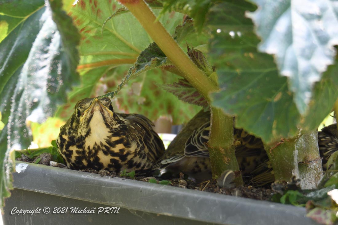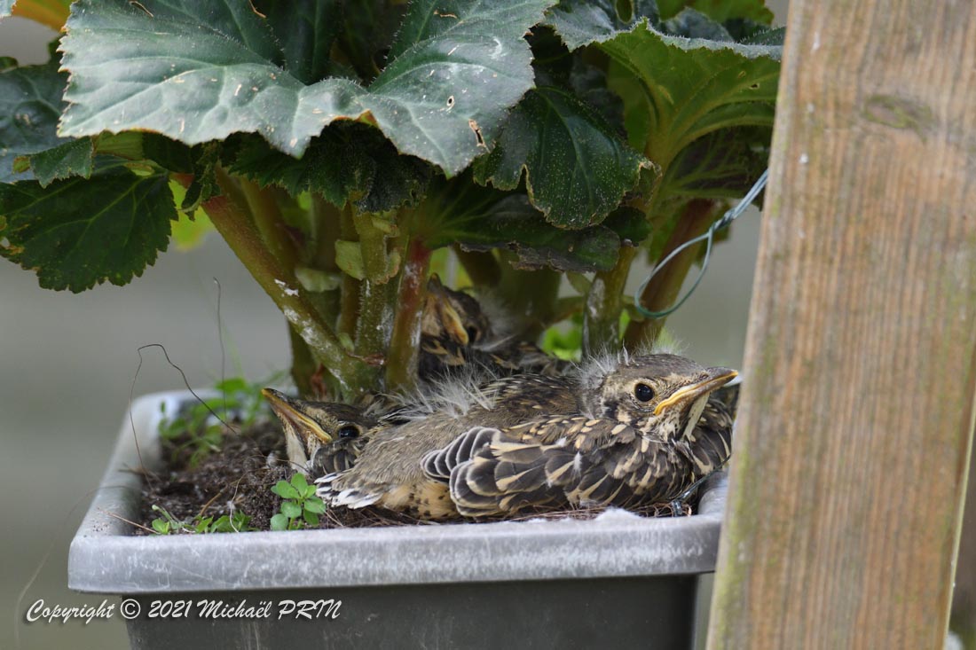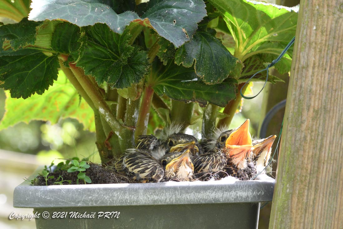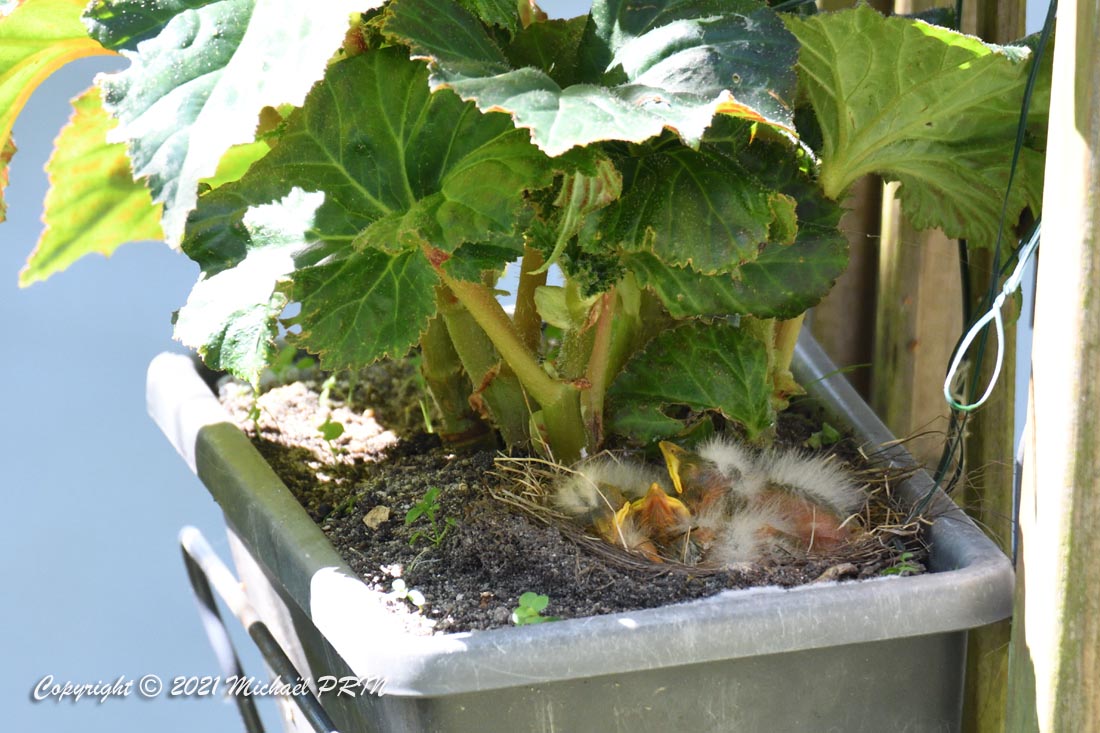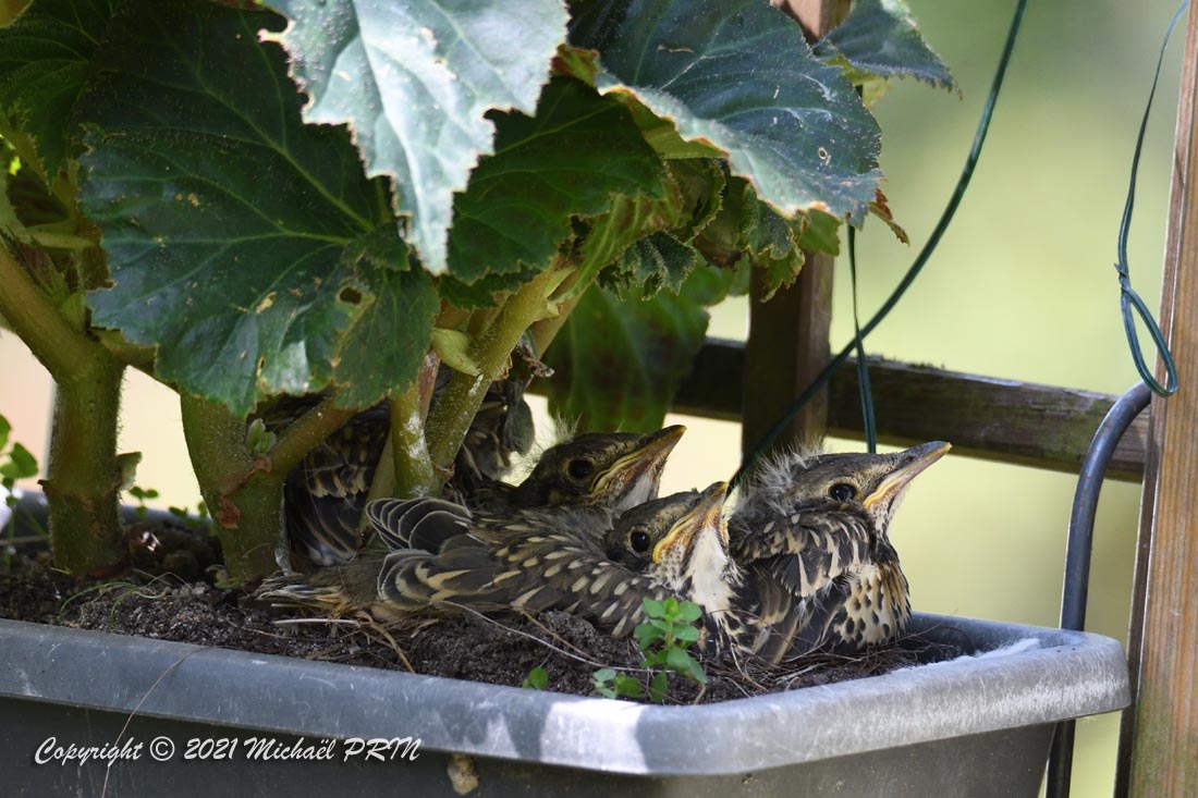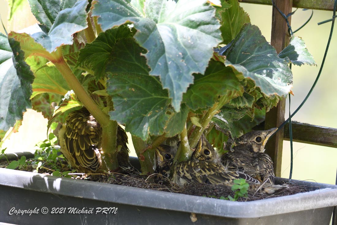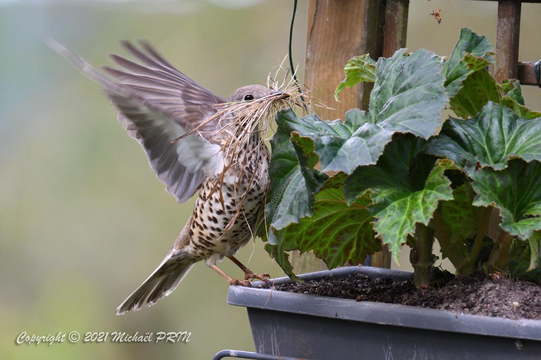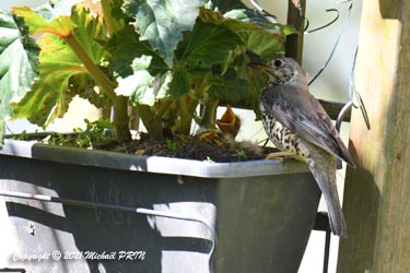 Cette femelle grive draine a choisi comme emplacement pour son nid une jardinère de bégonias située à 1,50 m du sol à côté d'un bassin. J'ai beaucoup hésité à la laisser continuer car je passe très souvent à moins de 2 mètres de l'arche où est posée la jardinière, et j'avais peur qu'elle finisse par abandonner sa nichée à cause du dérangement. J'ai finalement décidé de la laisser continuer en lui faisant bien comprendre qu'elle serait souvent dérangée en marquant bien ma présence.