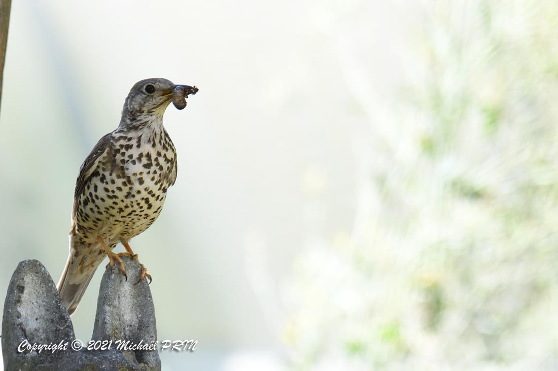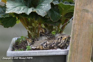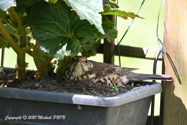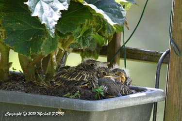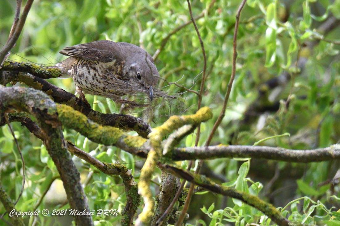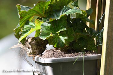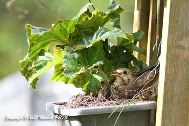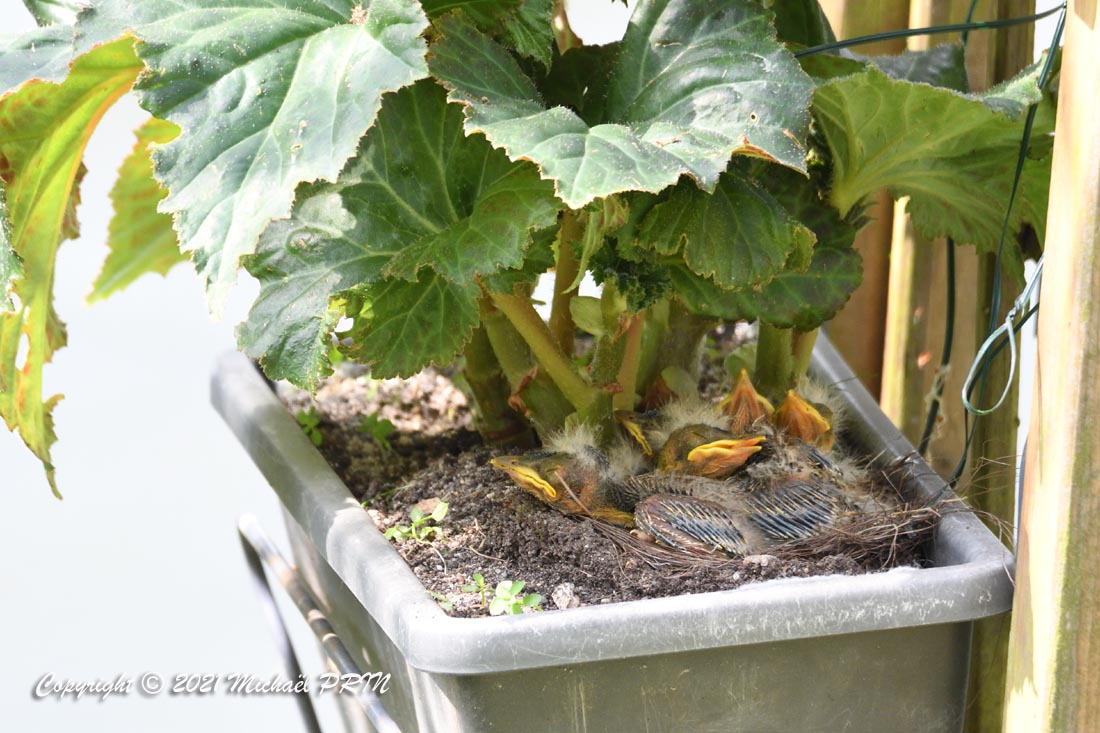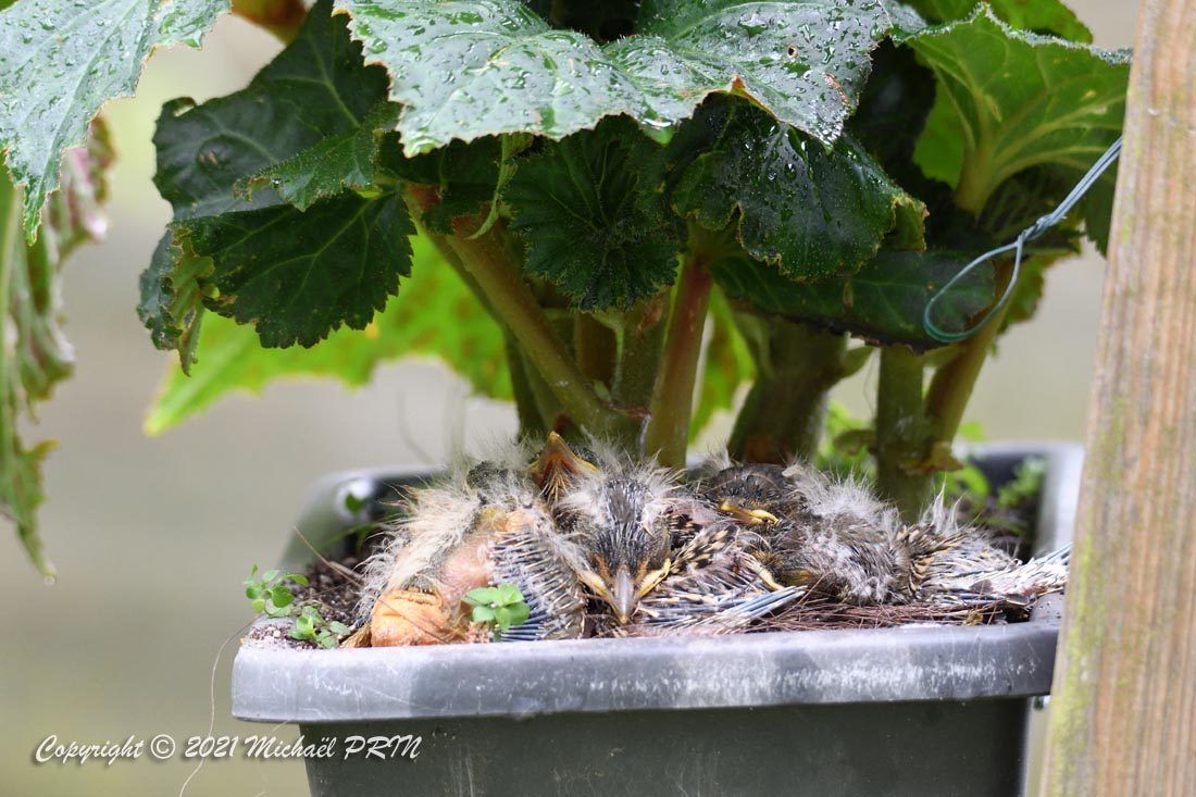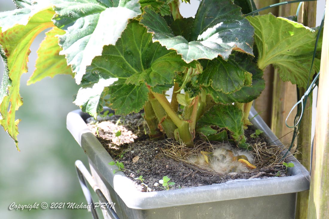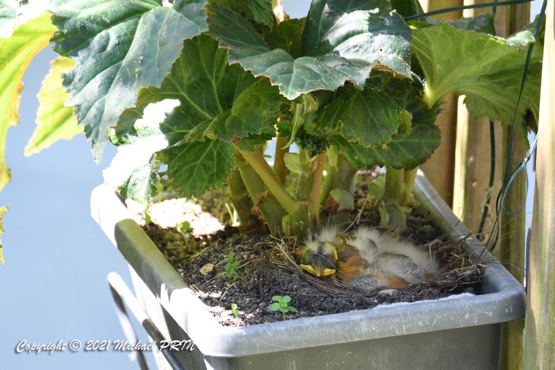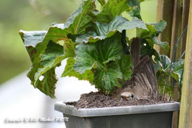 Cette femelle grive draine a choisi comme emplacement pour son nid une jardinère de bégonias située à 1,50 m du sol à côté d'un bassin. J'ai beaucoup hésité à la laisser continuer car je passe très souvent à moins de 2 mètres de l'arche où est posée la jardinière, et j'avais peur qu'elle finisse par abandonner sa nichée à cause du dérangement. J'ai finalement décidé de la laisser continuer en lui faisant bien comprendre qu'elle serait souvent dérangée en marquant bien ma présence.