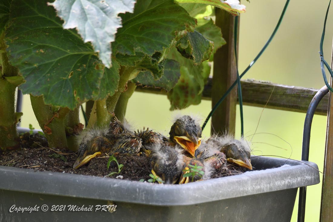 Pendant toute la période de couvaison (oeufs et petits), jamais elle ne s'envolera à mon passage, se contentant de me regarder, même à 2 mètres d'elle. Après la couvaison, je minimiserais mes passages, car je comprendrais vite que ma présence la gêne tout de même lors des nourrissages (chose qui ne s'était pourtant pas passée lors de ses précédentes nichées).