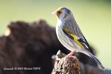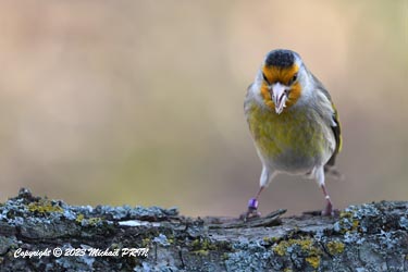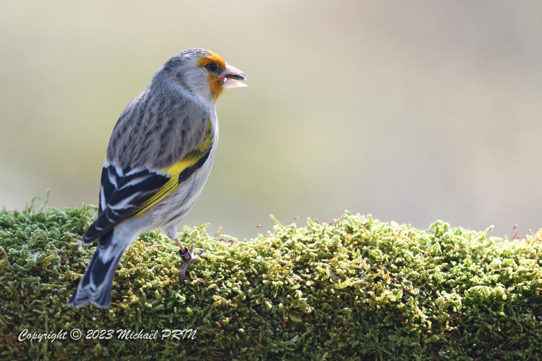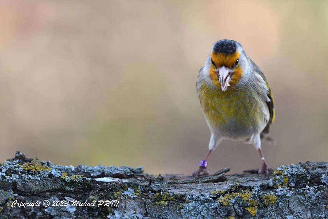 Cet oiseau très particulier n'est ni une espèce indigène ni une espèce exotique, il s'agit d'un oiseau d'élevage bagué issu d'un croisement entre un chardonneret élégant et un canari, communément appelé "mulet". Je n'ai pas pour habitude de publier des photos d'oiseaux d'élevage, mais celui-ci s'est retrouvé en liberté puis s'est mêlé à un groupe de chardonnerets qui venaient tous les jours à la mangeoire pendant l'hiver. Très peu farouche, on voit bien qu'il est habitué à l'homme, mais grâce au groupe, ses chances de survie sont plus élevées, contrairement à un individu qui n'aurait connu que la captivité et se serait retrouvé isolé.